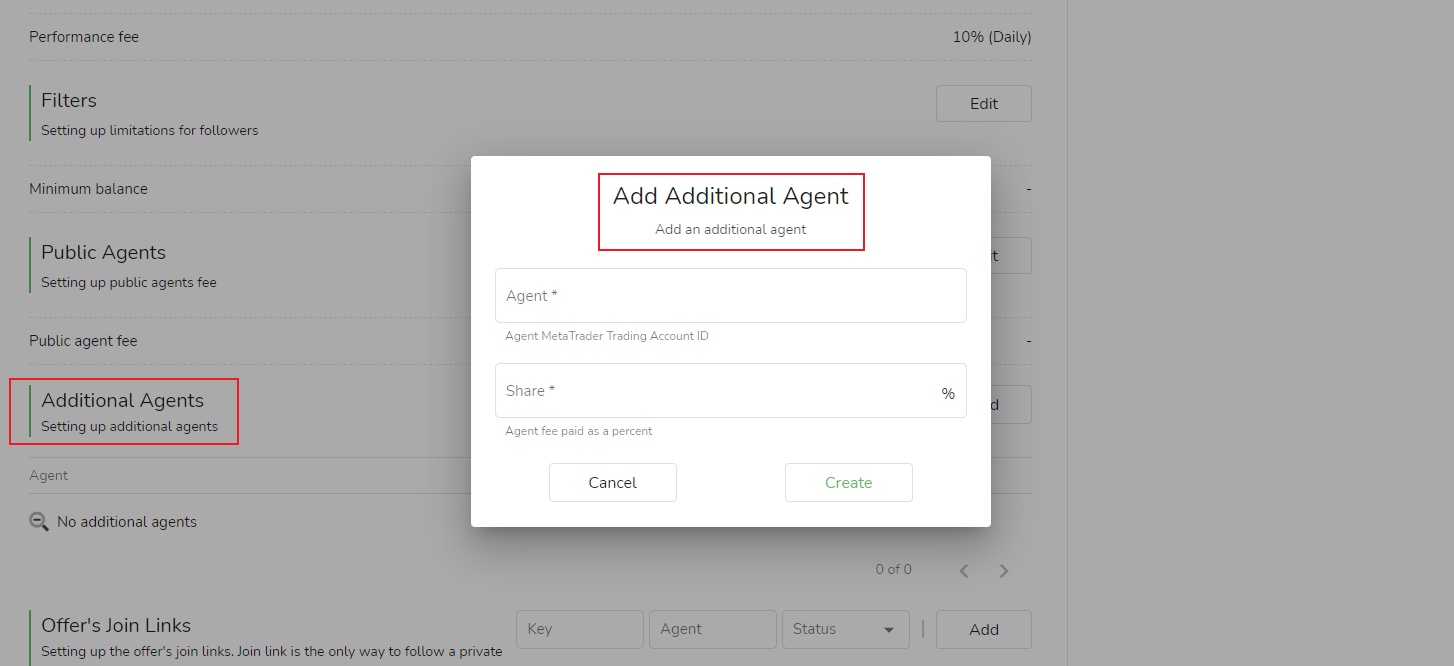بعد إنشاء رابط الانضمام بنجاح ، سيتم عرضه في الموضع أعلاه.سيحتوي ارتباط الانضمام هذا على معلمات حساب تداول MetaTrader الخاص بالمُعرّف ، لذلك سيتم تعيين المتابعين المسجلين من خلال رابط الانضمام مباشرةً إلى المُقدم المقابل.