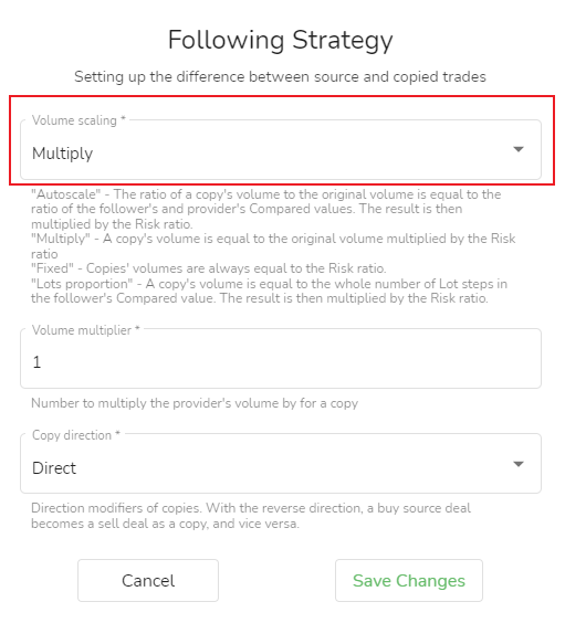 • The due position of the copy account is equal to the signal source account's transaction volume multiplied by the transaction volume multiplier