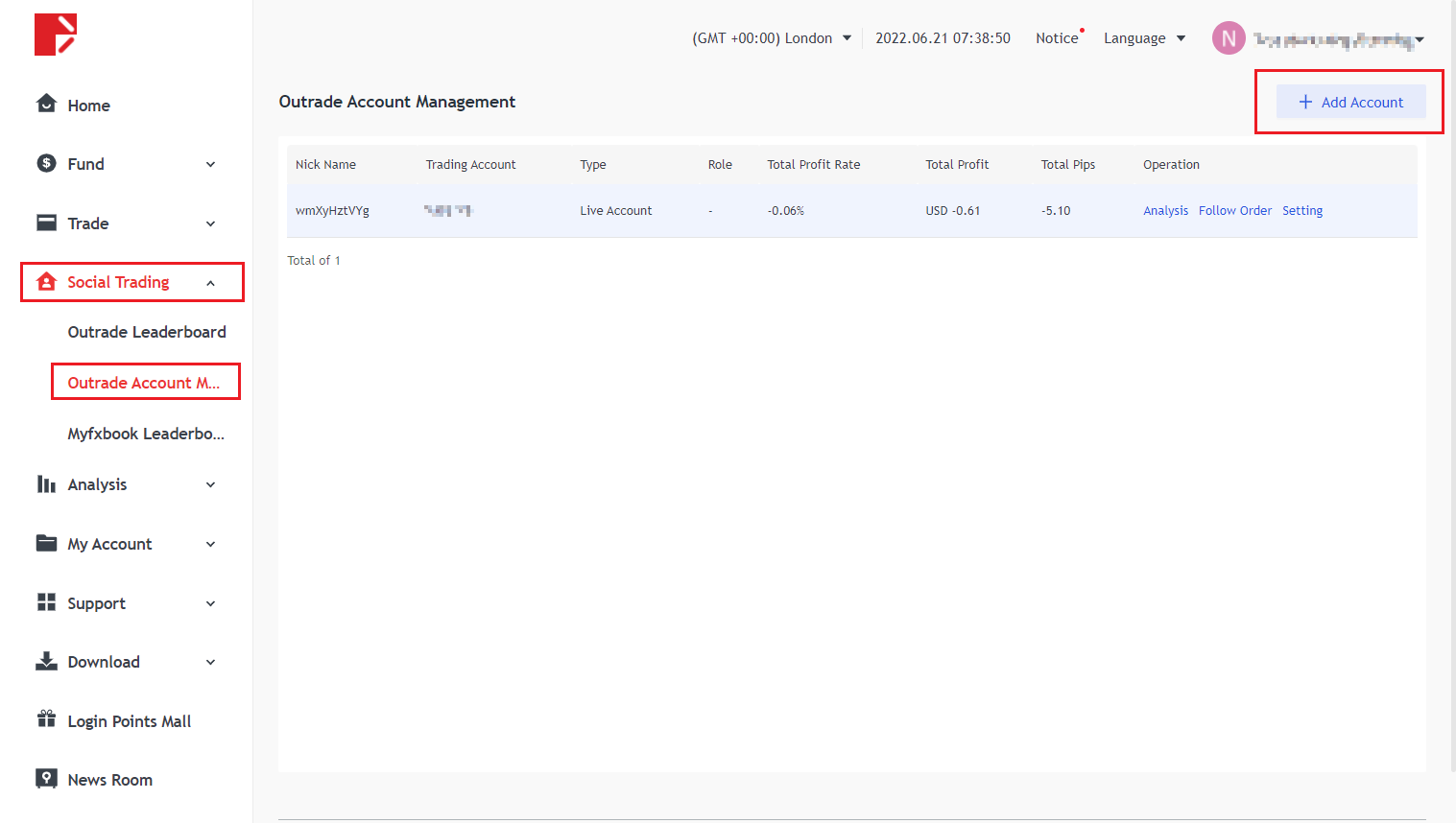 Log into your Doo Prime User Center and click “Social Trading” on the left side of the homepage. Then, click “Outrade Account Management” followed by clicking on “Add Account” on the right side of the page. Next, select to be the role of “Trader” or “Follower”, and connect your Outrade account with Doo Prime User account at last.