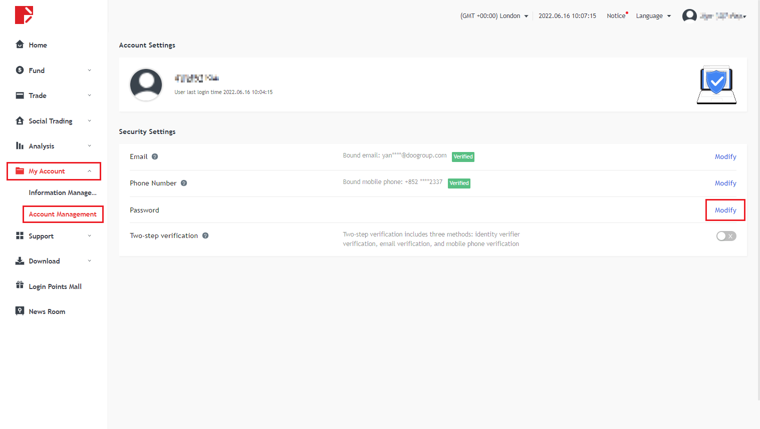 1. D Prime 사용자 센터에 로그인한 후, 왼쪽 열의 "내 계정"을 클릭하고, "계정 관리"를 선택하여 "계정 설정" 인터페이스에 들어간 후, "비밀번호" 섹션에서 "변경"을 클릭하세요.