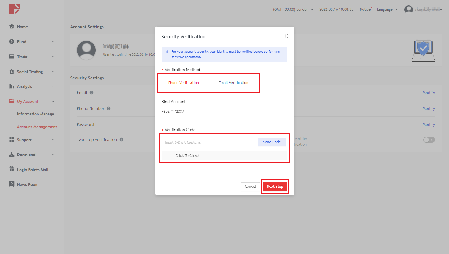2. 인증을 위해 휴대폰 또는 이메일을 선택할 수 있습니다. "확인하려면 클릭하십시오"를 클릭하십시오. 인증을 통과하면 시스템에서 휴대폰 정보 또는 이메일을 통해 인증 코드를 보내드립니다. 인증 코드를 입력하고 "다음"을 클릭하십시오.