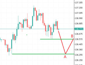 c) USDJPY의 가격이 라인 A를 하향 터치하면 라인 B에서 매도 지정가 주문을 활성화하고 가격이 라인 A에서 라인 B로 반등하면 라인 B의 가격으로 매도 주문이 실행됩니다.