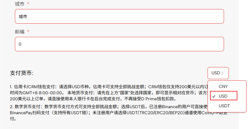 - 在付款页面 “支付货币” 下拉菜单中选择 USD,即可在跳转后的页面看到信用卡支付通道。