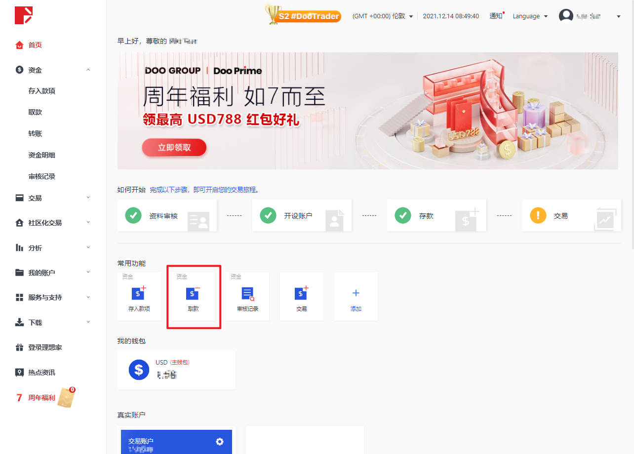 登录进入Doo Prime 用户中心首页后,在「常用功能」一栏点击「取款」。