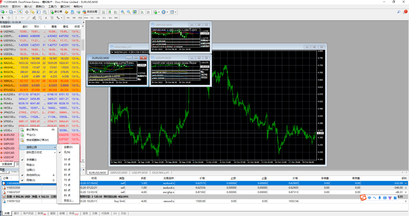 请在终端栏中点击「交易」查看现有订单 ,之后右键选中持有订单,点击「追踪止损」后选择「自定义」,填写您所需设置的追踪止损点数。