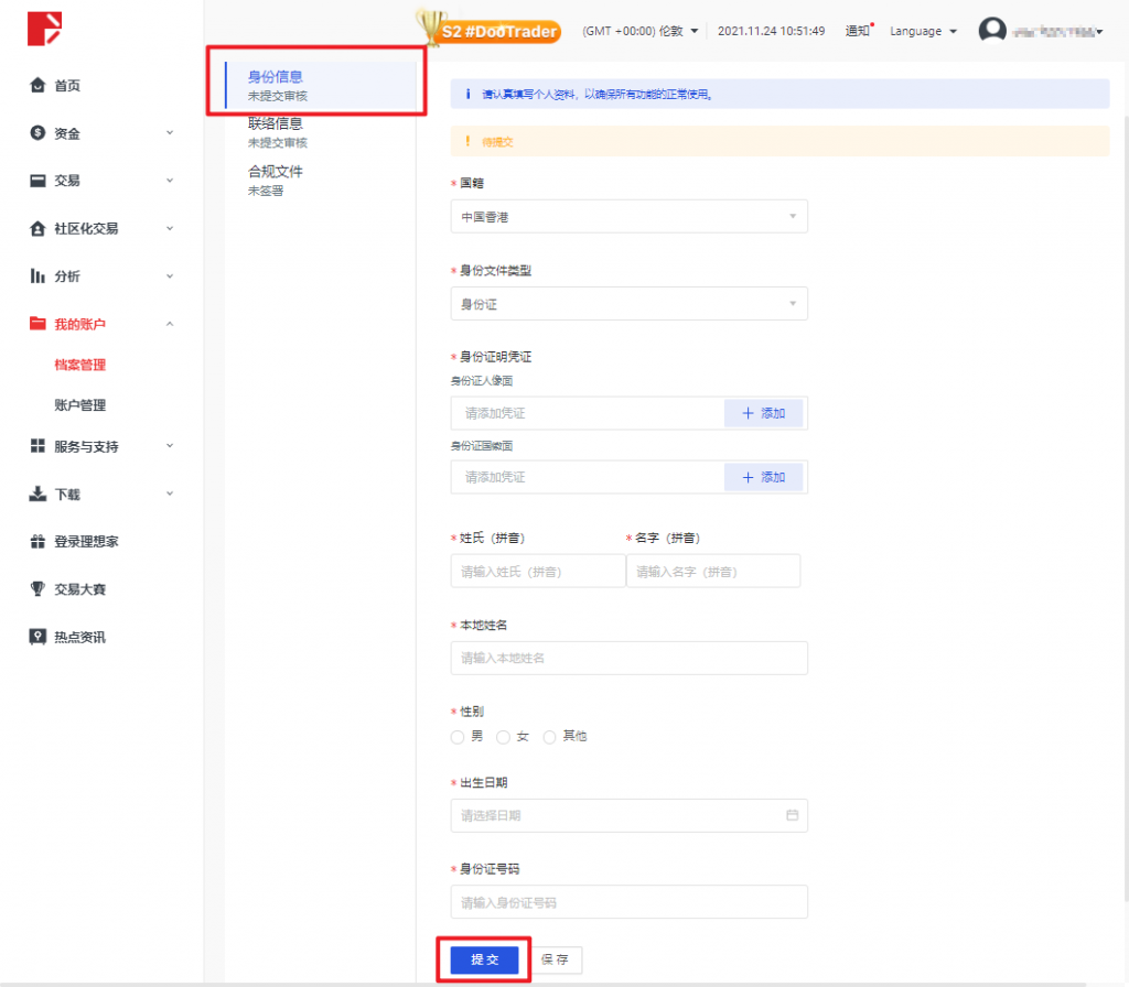 進入「身份信息頁面」,填寫個人資料。上傳身份證後,只需填寫開戶姓名(拼音),其他信息系統會根據證件資料自動填寫,完成後點擊「提交」。請留意證件的有效期必須要在6 個月以內。