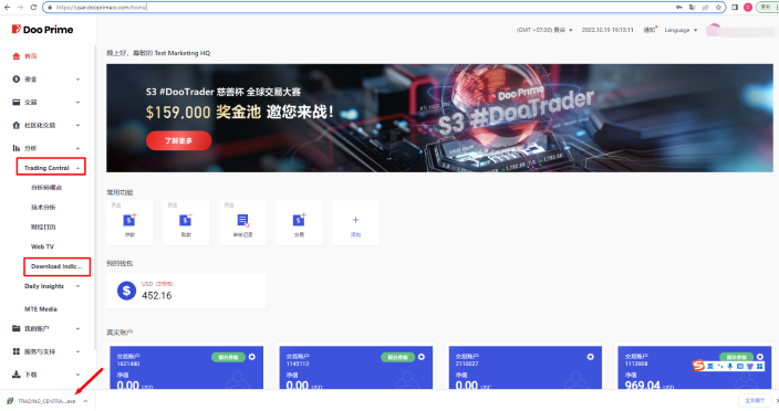 1. 首先請您登錄Doo Prime 用戶中心,然後點擊左側菜單欄「分析」後選擇「 Download Indicators 」。此時請查看底部菜單欄, Trading Central 指標已經下載完成。