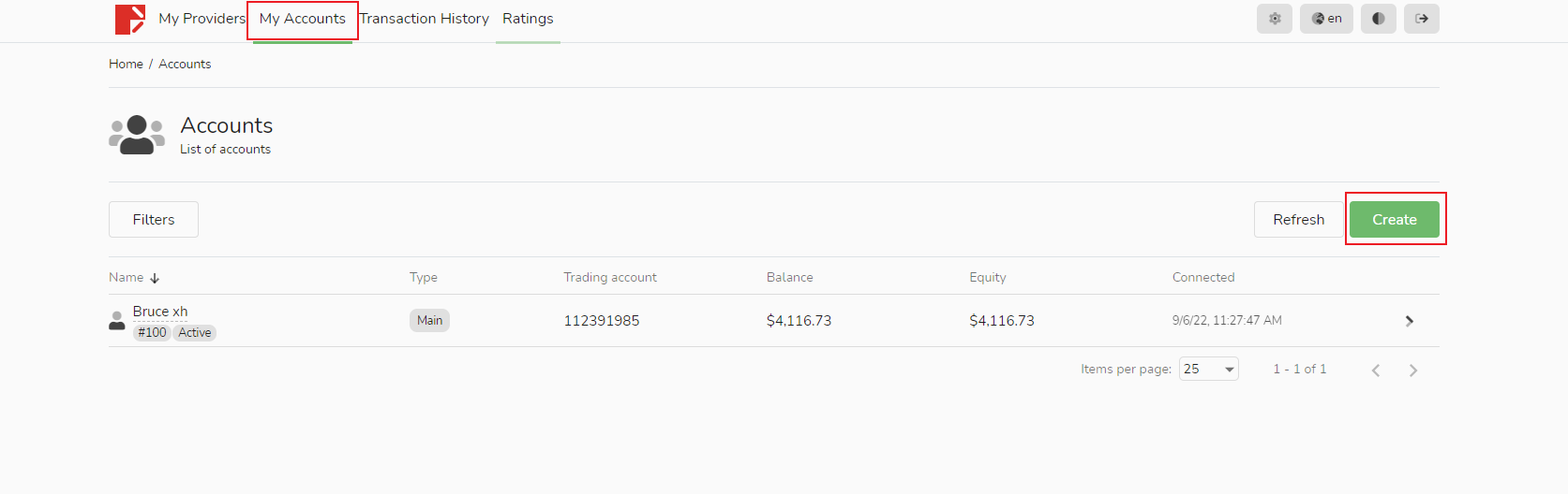 1. Bạn có thể đăng nhập vào CopyTrading, trong cột "Tài khoản của tôi", nhấp vào nút màu xanh lá cây "Tạo" ở bên phải.