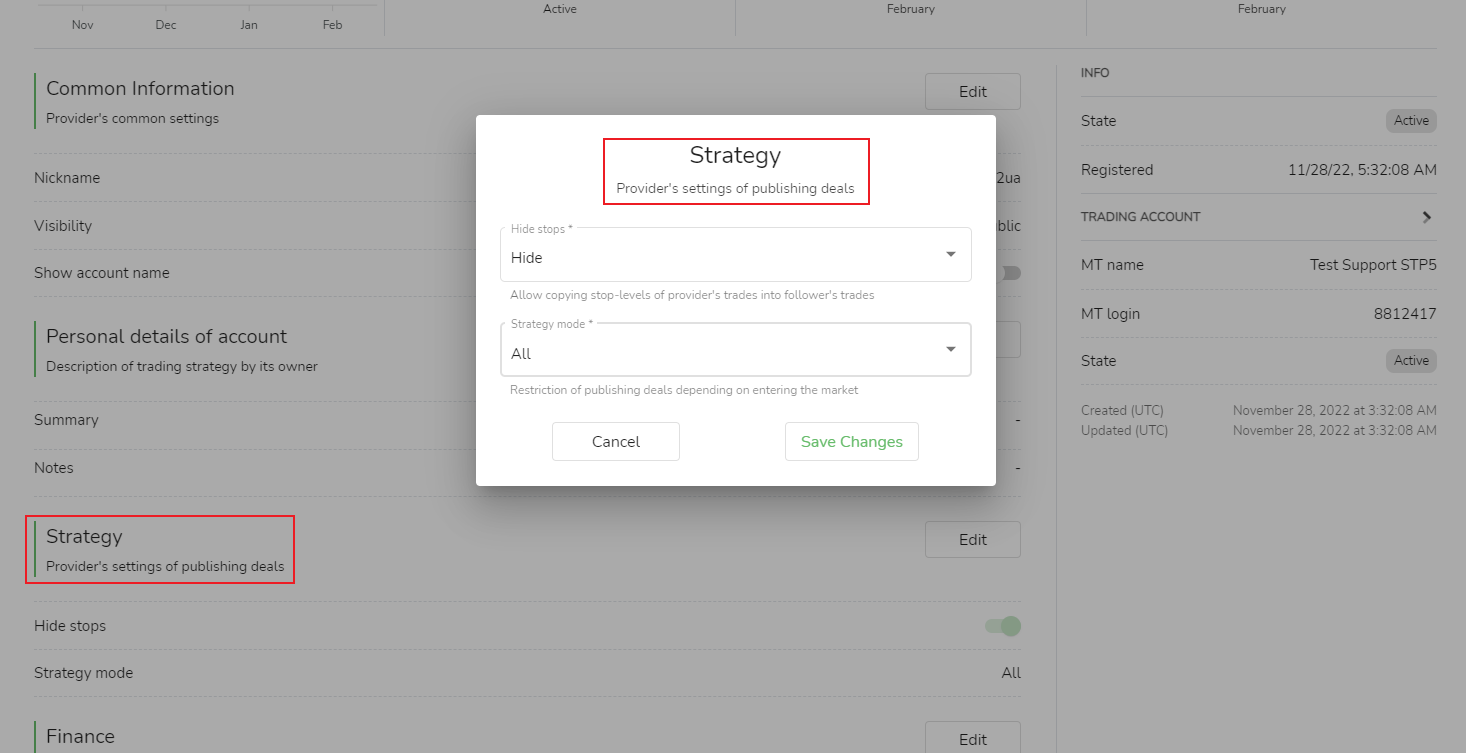 • Mô hình chiến lược:Bạn có thể chọn [Cung cấp các đơn đặt hàng đang chuyển tiếp và các đơn đặt hàng mới để theo dõi] hoặc [Chỉ cung cấp các đơn đặt hàng mới để theo dõi] để thông báo các hạn chế giao dịch nhằm xác định xem những người theo dõi có tham gia thị trường hay không.