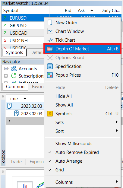 Vì MT5 có thể được kết nối trực tiếp với sàn giao dịch tại chỗ, nên có thể xem độ sâu thị trường của các sản phẩm giao dịch trên MT5, đây là một chức năng quan trọng giúp phân biệt MT5 với MT4 và MT5 có thể sử dụng độ sâu thị trường cho các lệnh đang chờ xử lý: